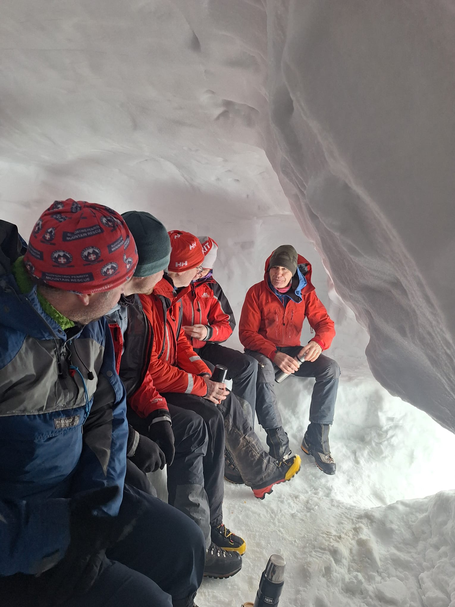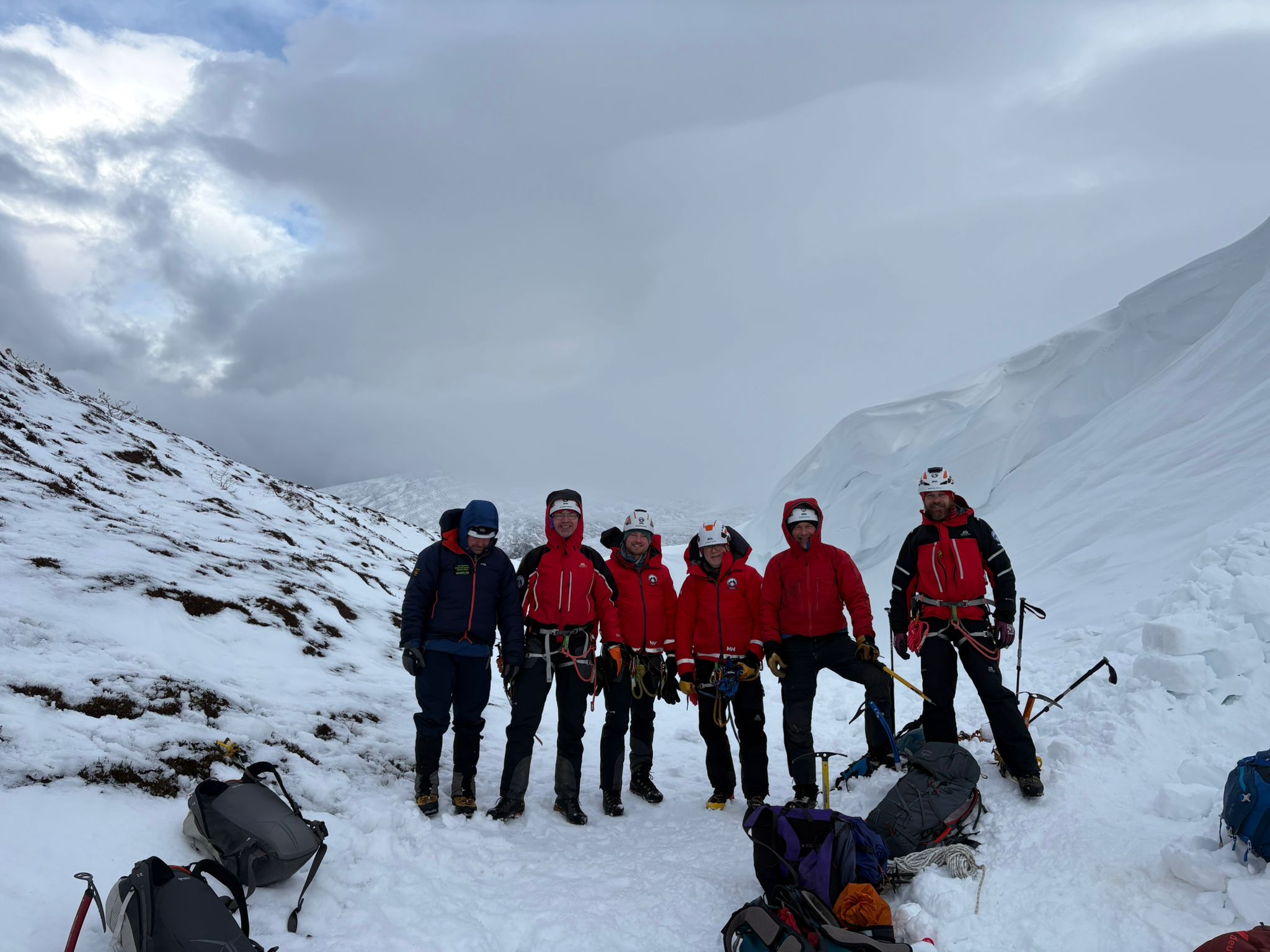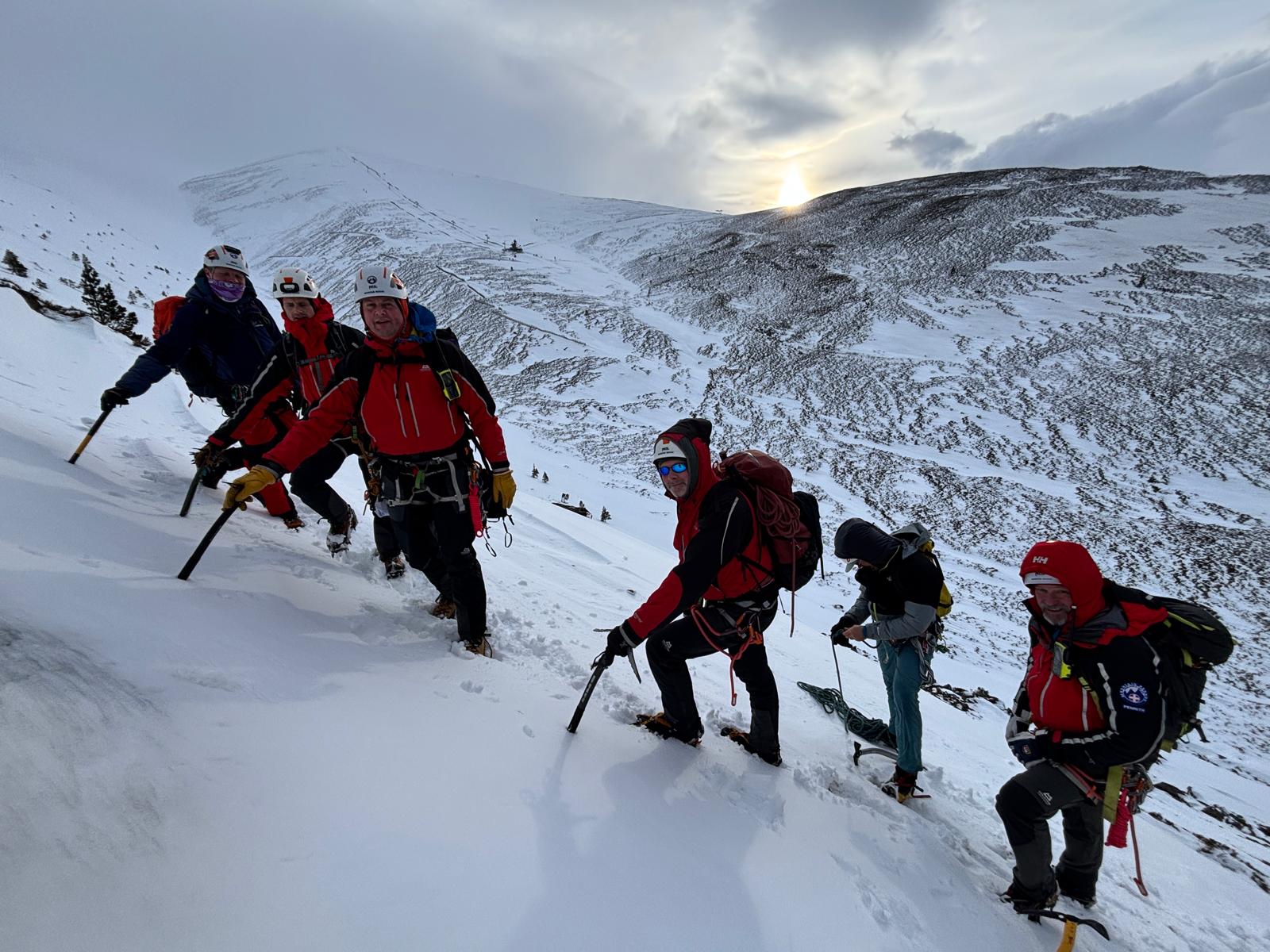 Plenty of snow and a cold south-easterly wind awaited the Team for our Caringorms training in the techniques and skills required to rescue in full-on winter conditions. Saturday was spent working in groups with professional winter mountaineering instructors, refreshing safe movement on steep snow-covered ground and practising snow belaying techniques. On Sunday we tackled two scenarios. The first involved a search, following an avalanche, for buried items utilising transceivers and probes, and once located safey digging out with shovels. The second involved lowering a casualty in a stretcher down a snow slope using in turn both twin rope and back rope systems, and utilising a variety of snow anchors. Note the line of bucket seats down the slope! A great weekend: we trained hard, and after hours played hard! A big thank you to the three wonderful Friends of the Team, who catered for us royally over the weekend. And to Cranstons Butcher + Maker for support with provisions. Thanks also to Patterdale Mountain Rescue Team for covering our patch whilst most of us were out of area.