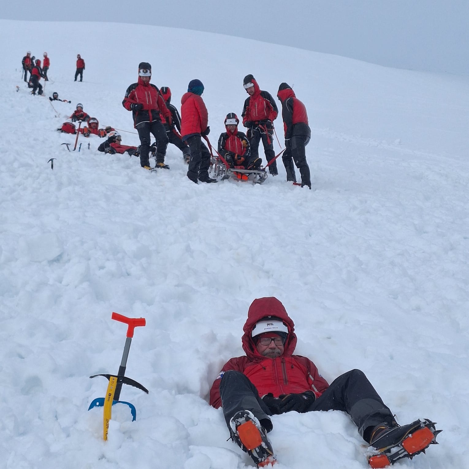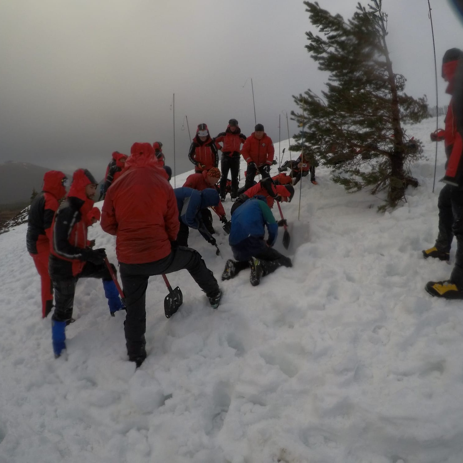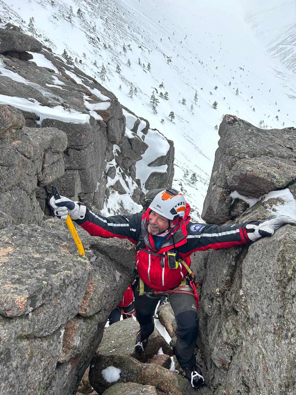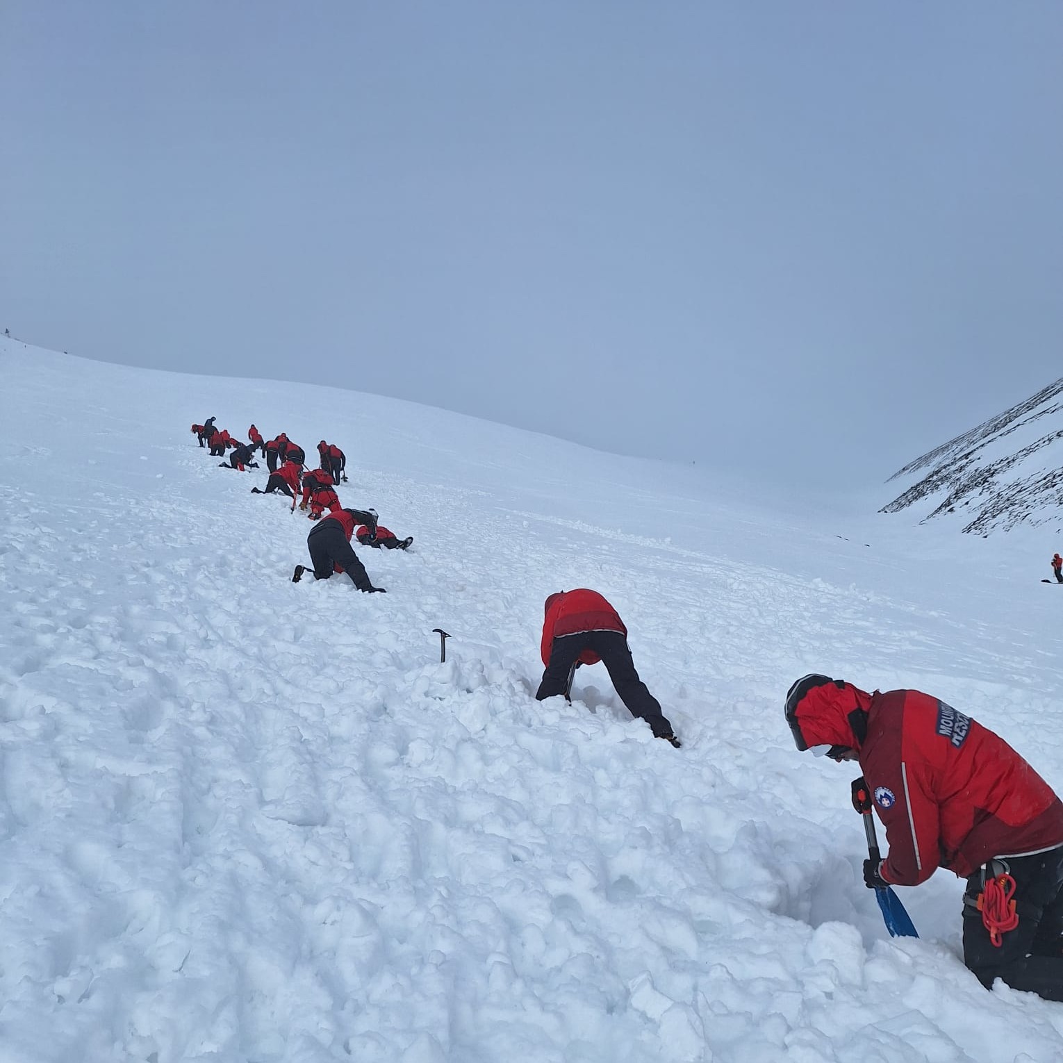 Plenty of snow and a cold south-easterly wind awaited the Team for our Caringorms training in the techniques and skills required to rescue in full-on winter conditions. Saturday was spent working in groups with professional winter mountaineering instructors, refreshing safe movement on steep snow-covered ground and practising snow belaying techniques. On Sunday we tackled two scenarios. The first involved a search, following an avalanche, for buried items utilising transceivers and probes, and once located safey digging out with shovels. The second involved lowering a casualty in a stretcher down a snow slope using in turn both twin rope and back rope systems, and utilising a variety of snow anchors. Note the line of bucket seats down the slope! A great weekend: we trained hard, and after hours played hard! A big thank you to the three wonderful Friends of the Team, who catered for us royally over the weekend. And to Cranstons Butcher + Maker for support with provisions. Thanks also to Patterdale Mountain Rescue Team for covering our patch whilst most of us were out of area.